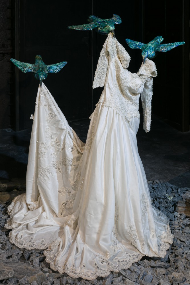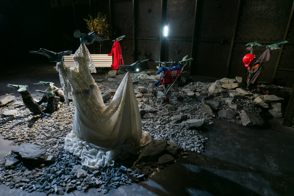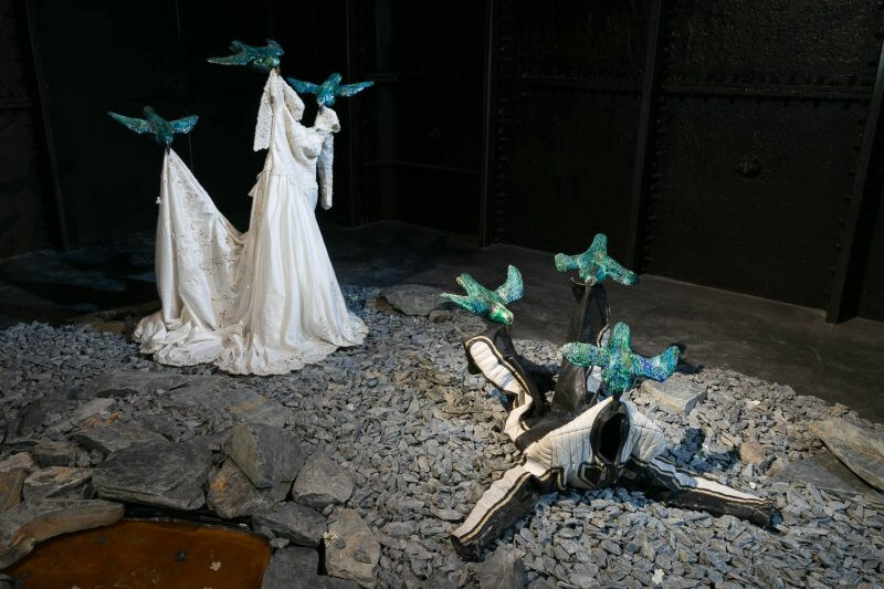 ceramics, wedding dress, metal structure, stones 130×110×120cm 2018
