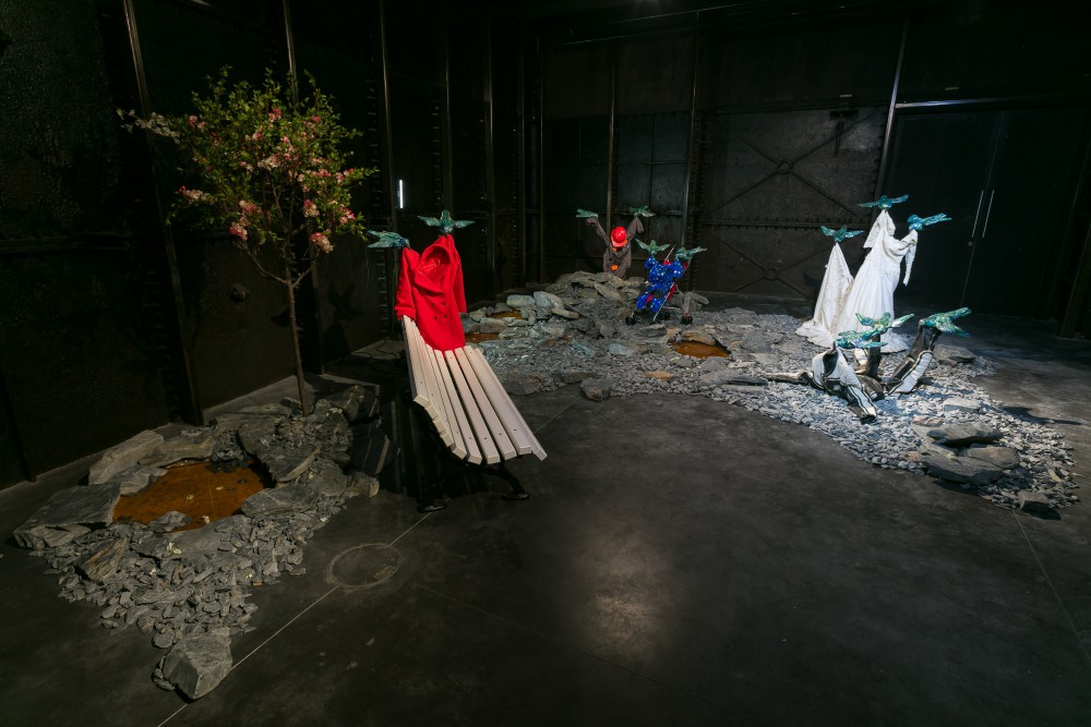clothes, rocks, metall stands, cherry trees, strobe lights 2018